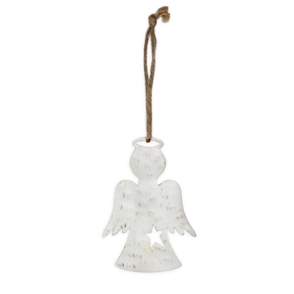 Kovový anděl v bílé barvě – čistá a jemná závěsná dekorace pro duchovní i sváteční výzdobu.