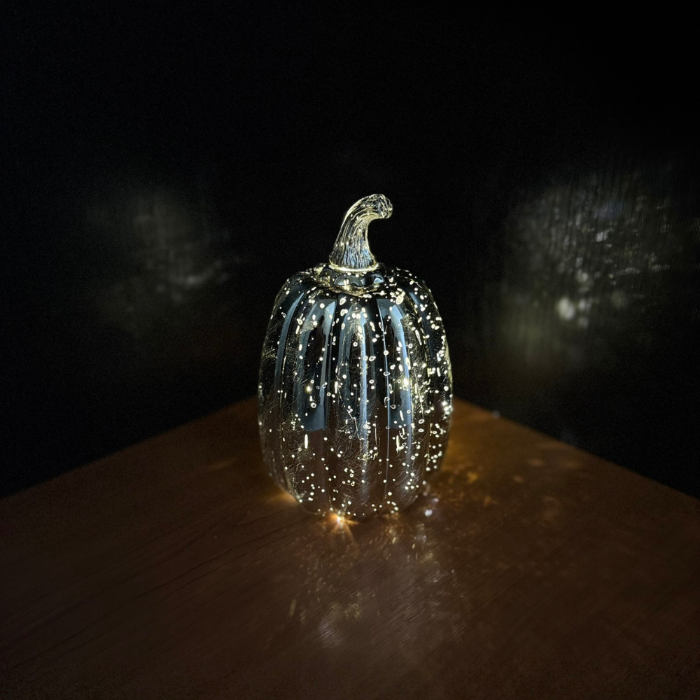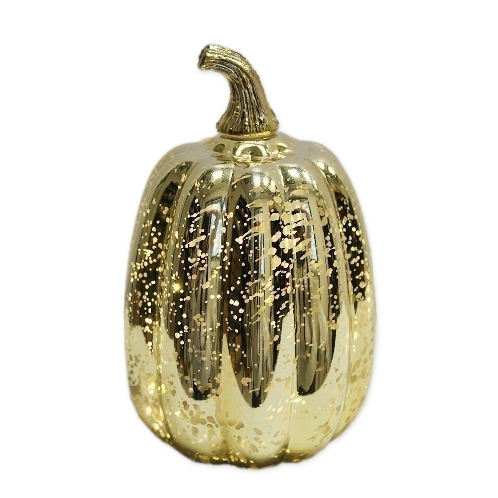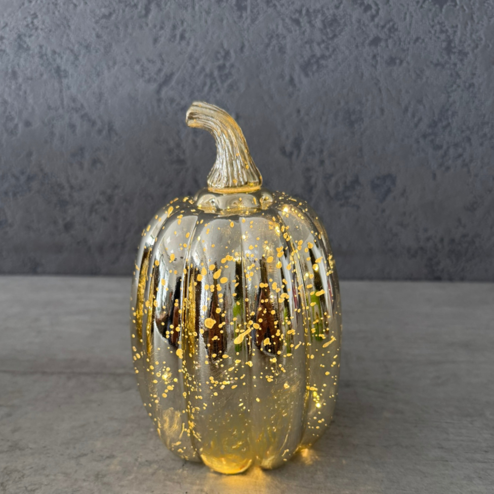 Skleněná dýně s LED světýlkem v elegantním zlatém provedení. Ideální pro podzimní výzdobu se špetkou luxusu!