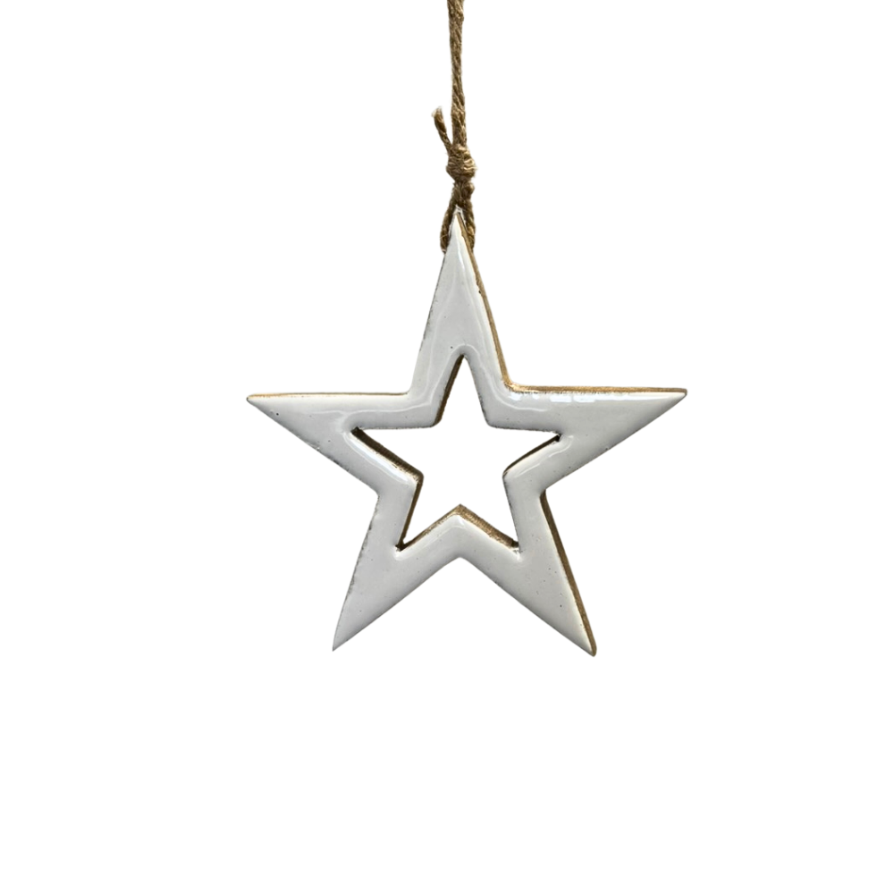 Elegantní závěsná hvězda z přírodního dřeva v bílé barvě. Dodá výzdobě svěží a slavnostní vzhled.