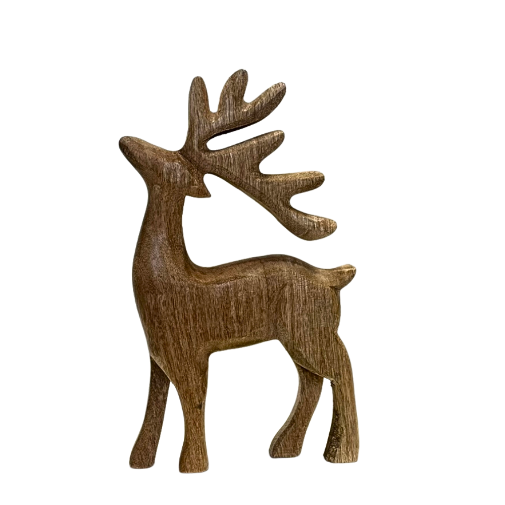 Větší jelen z přírodního dřeva působí majestátně a slavnostně. Krásný doplněk k vánočním dekoracím.