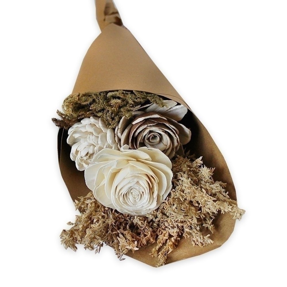 Hotová kytice kombinující přírodní sušinu a pěnové květy. Trvalá a elegantní dekorace.