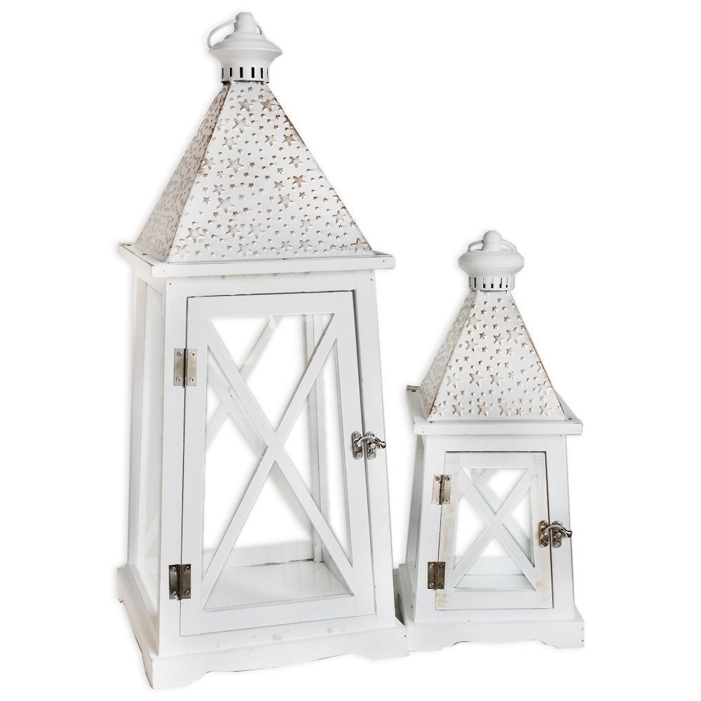 Set dvou bílých luceren s kovovými detaily. Skvělé pro ozdobení vstupu do domu, balkonu nebo obývacího pokoje.