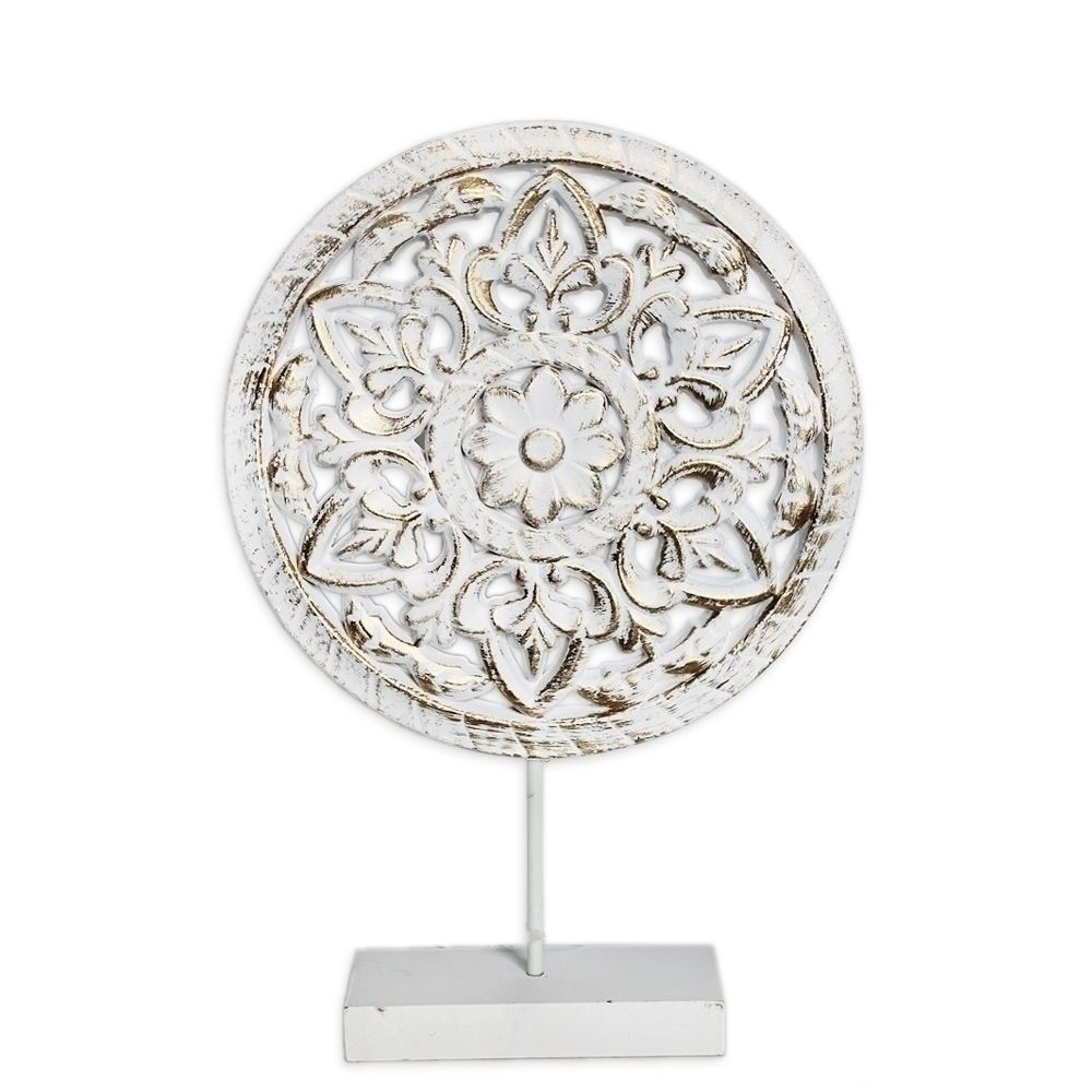 Dřevěná mandala na stojánku v bílé barvě – harmonický prvek pro interiérové dekorace.