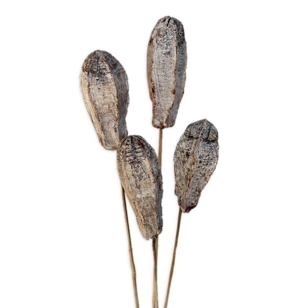 Přírodní mahagonové lusky v jemné bílé patině. Atraktivní exotický prvek do aranžmá.