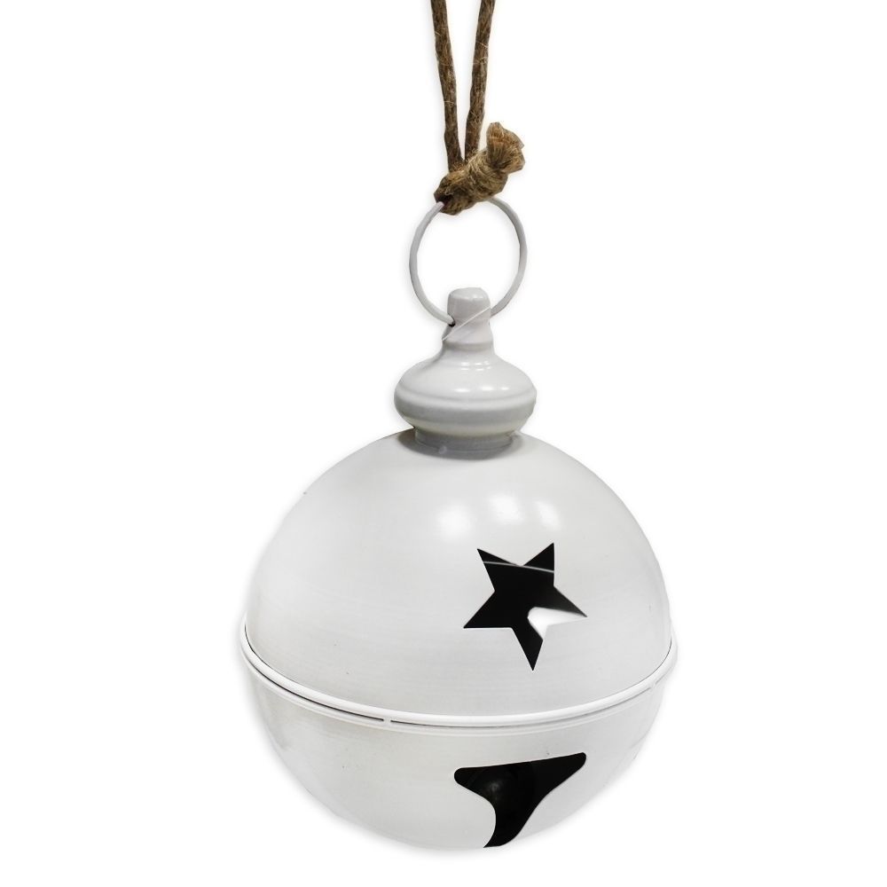 Bílá kovová rolnička pro elegantní vánoční výzdobu.