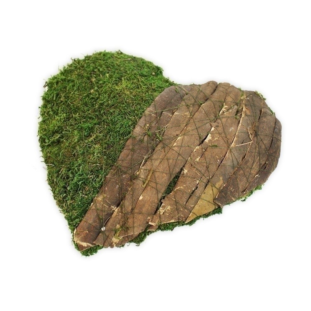 Menší varianta mechového srdce s kůrou. Jemná přírodní dekorace vhodná na zavěšení.