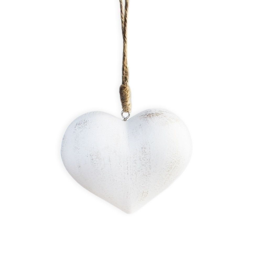 Jemné závěsné srdce z dřeva s bílou patinou – romantický detail do každého interiéru.