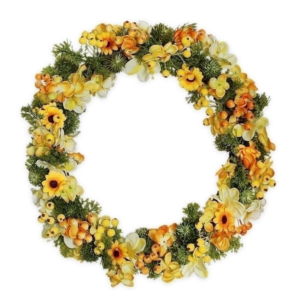 Největší varianta žlutého květinového věnce. Výrazná a optimistická dekorace, která okamžitě oživí každý prostor.