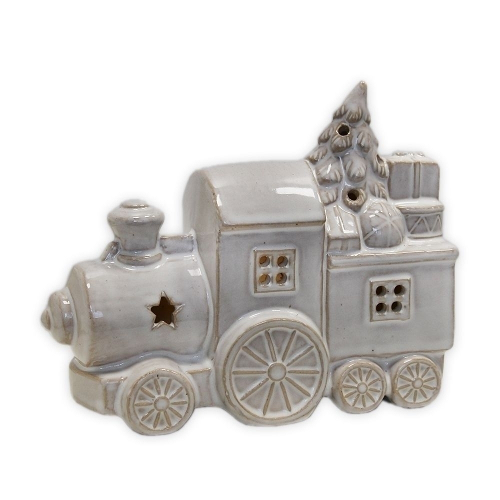 Vánoční porcelánový vlak se světlem pro radostnou atmosféru.