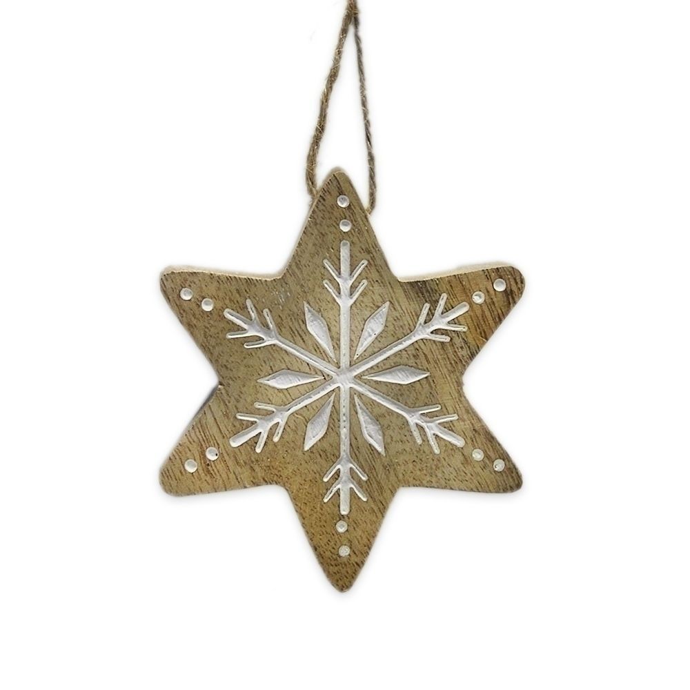 Menší závěsná vločka ze dřeva se hodí na stromek i do sváteční výzdoby.
